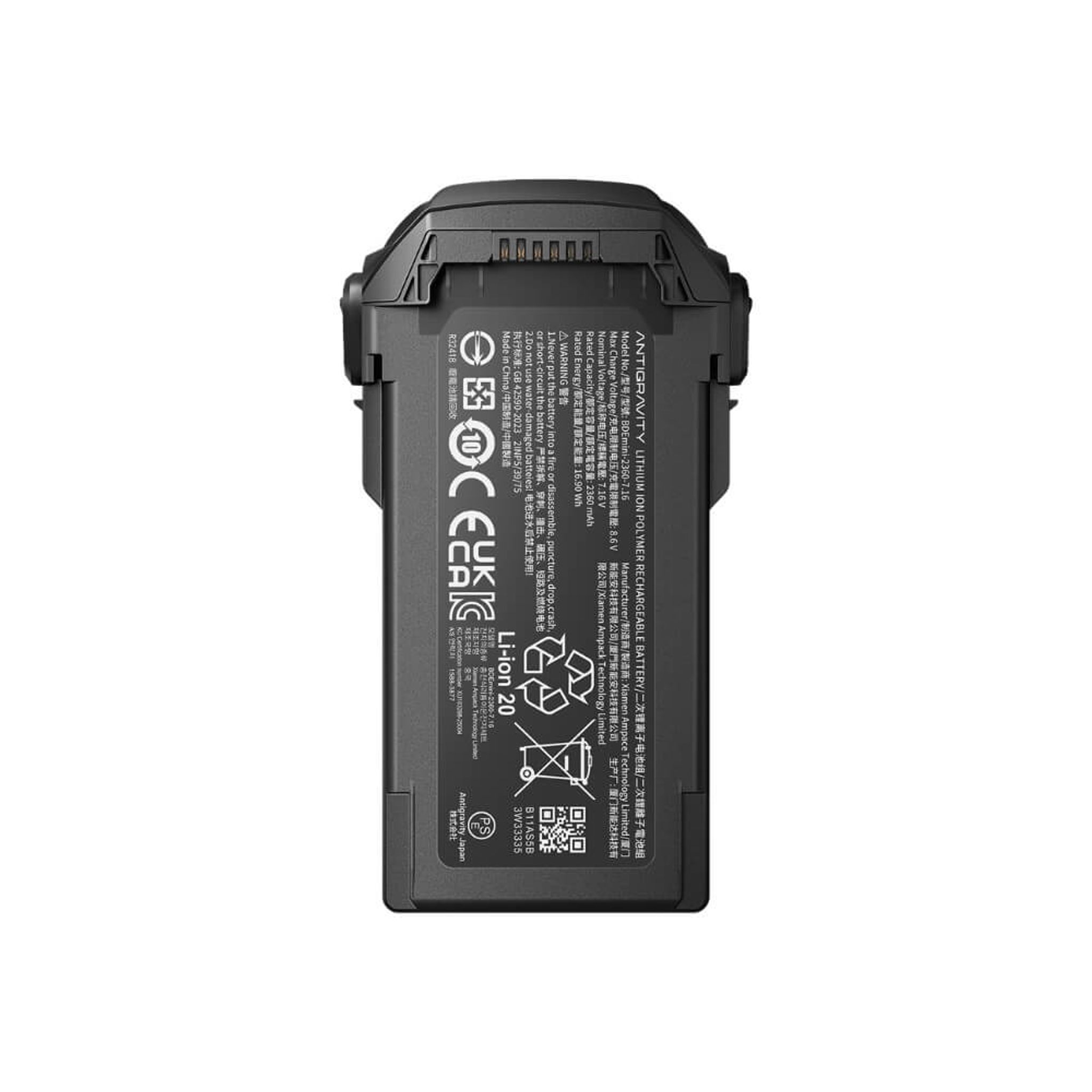Antigravity A1 Flight Battery er et batteri med standardkapacitet til Antigravity A1. Disse batterier har en kapacitet på 2360 mAh, vejer kun 67,5 gram og kan derfor bruges med droner, der er C0-klassificerede.